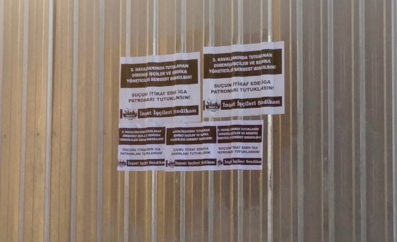 İnşaat-İş, Fikirtepe’de bulunan çeşitli şantiyelerin etrafında tutuklu arkadaşlarının serbest bırakılmasını isteyen afiş çalışması yaptı.