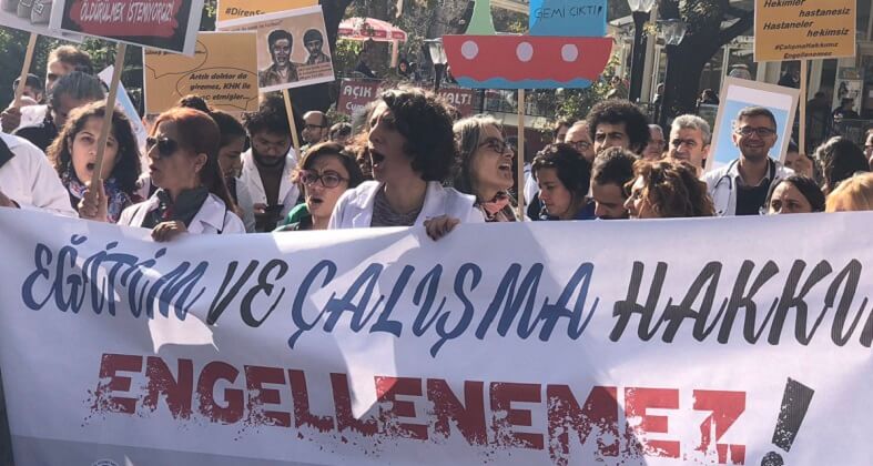 Türk Tabipleri Birliği ve Sağlık ve Sosyal Hizmet Emekçileri Sendikası, Ankara Kuğulu Park’ta “Eğitim ve çalışma hakkımız engellenemez!” şiarı ile eylem gerçekleştirdi. Sağlık emekçileri, ihraç edilen hekimlerin çalışmasını engelleyen yasa tasarısının geri çekilmesini istedi.