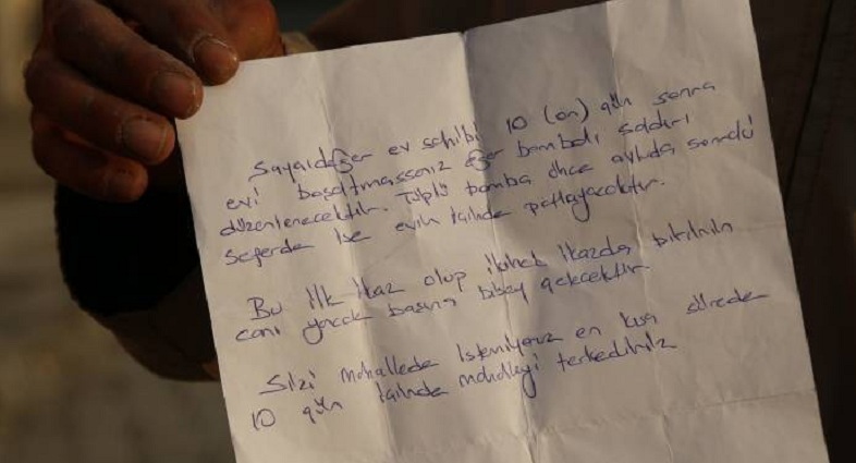 “Saygıdeğer ev sahibi 10 (on) gün sonra evi boşaltmazsanız eğer bombalı saldırı düzenlenecektir. Tüplü bomba önce avluda sonraki seferde ise evin içinde patlayacaktır. Bu ilk ikaz olup ikinci ikazda birinin canı yanacak başına bir şey gelecektir. Sizi bu mahallede istemiyoruz. En kısa sürede yani 10 gün içinde mahalleyi terk ediniz.”