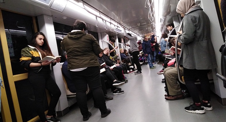 Bu fotoğraflar Üsküdar-Çekmeköy metrosundan… Adeta “kitap okumayın” çağrılarının yapıldığı, “Kitap okuyan çok sorguluyor, soru soruyor, ateist oluyor” denilerek lanetlendiği ya da “gençlik bitti, kaybettik” diye umutsuzluk vazedenlere verilen anlamlı bir yanıt sanki.