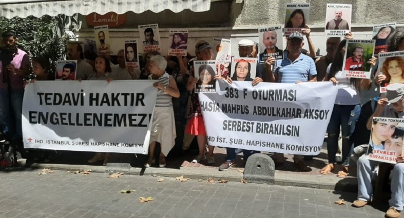 Bu hafta hasta tutsak Abdulkahar Aksoy’un durumuna dikkat çekilen eylemde, “Tedavi haktır, engellenemez” ve ” 383’üncü F oturması hasta mahpus Abdulkahar Aksoy serbest bırakılsın” pankartları açıldı.