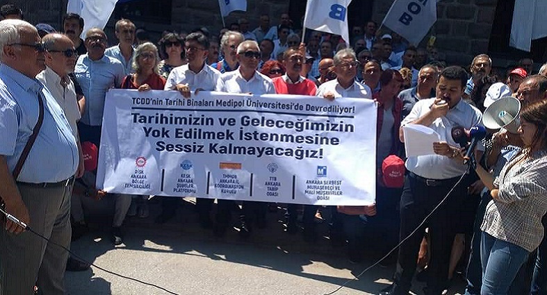 DİSK Ankara Bölge Temsilciliği, KESK Ankara Şubeler Platformu, TMMOB Ankara İl Koordinasyon Kurulu, Ankara Tabip Odası, Ankara Serbest Muhasebeci ve Mali Müşavirler Odası, TCDD’ye ait tarihi binaların Medipol Üniversitesi’ne devredilmesini protesto etti.