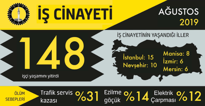 Ocak ayında en az 159 işçi, Şubat ayında en az 127 işçi, Mart ayında en az 114 işçi, Nisan ayında en az 153 işçi, Mayıs ayında en az 164 işçi, Haziran ayında en az 131 işçi, Temmuz ayında en az 178 işçi ve Ağustos ayında en az 148 işçi olmak üzere; Türkiye’de 2019 yılının ilk sekiz ayında en az 1174 işçi iş cinayetlerinde yaşamını yitirdi…
