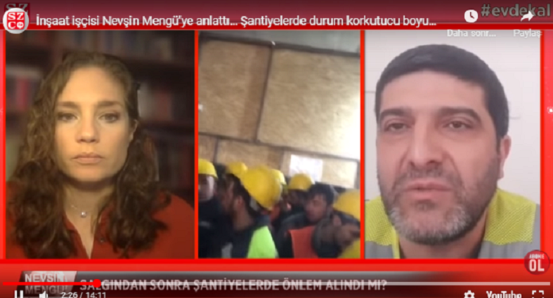 Kendisi de işçi olarak çalışan İnşaat-İş Sendikası Yönetim Kurulu Üyesi Tezcan Acu, Nevşin Mengü’nün Sözcü TV’deki programına katılarak inşaat işçilerinin koronavirüs salgınında hangi koşullarda çalıştırıldıklarını, sendika olarak bu koşullarda nasıl bir politika izlediklerini, taleplerini anlattı.