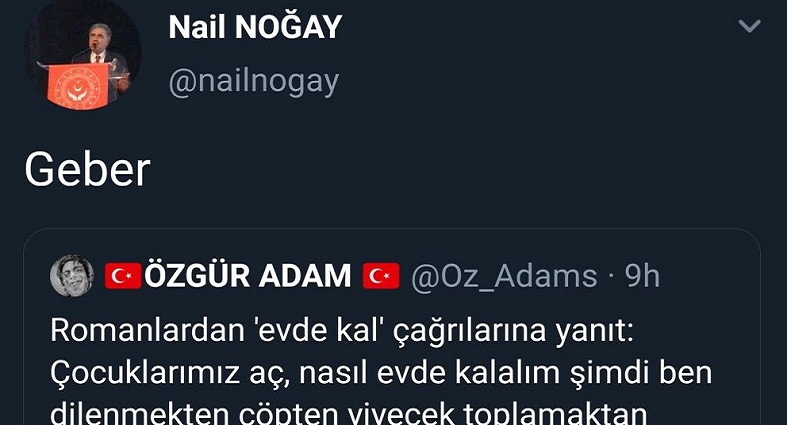 Euronews’un yer verdiği ve bir sosyal medya kullanıcısının “Romanlardan ‘evde kal’ çağrılarına yanıt: Çocuklarımız aç, nasıl evde kalalım şimdi ben dilenmekten çöpten yiyecek toplamaktan geliyorum” diyerek paylaştığı ve Noğan’ın “Geber” notuyla sayfasına taşıyıp, tepkiler üzerine 7 saat sonra silmek zorunda kaldığı o videoda Roman kadın tüm emekçilerin isyanını oldukça yalın cümlelerle şöyle ifade ediyordu: