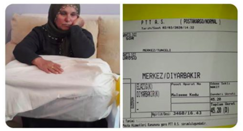 Cenaze İstanbul-Dersim-Diyarbakır üçgeninde PTT’yle dolaşır durur. Cenaze dediğimize bakmayın, cenaze dediğimiz şey, 3 yıldır “emanet” adı altında oradan oraya savrulan kemikleridir Agit’in. Diyarbakır Adliyesi’nde emanet nedir diye sorar anne: “Kemikleriniz gelmiş, kutunun içinde…”