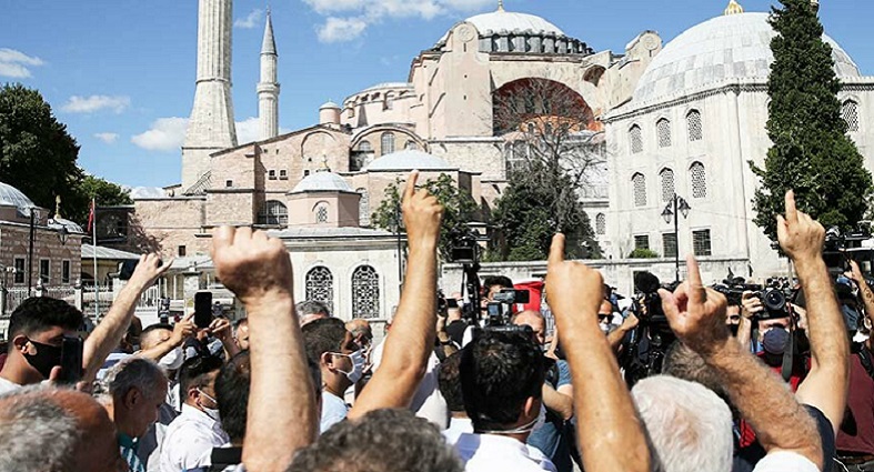 Karar Meclis’te törensel havada açıklandı, sosyal medyada heştegler açıldı, tekbir sesleriyle Ayasofya önünde toplananlar ezanın sesiyle cihat kazanmış duygusu yaşadı.
