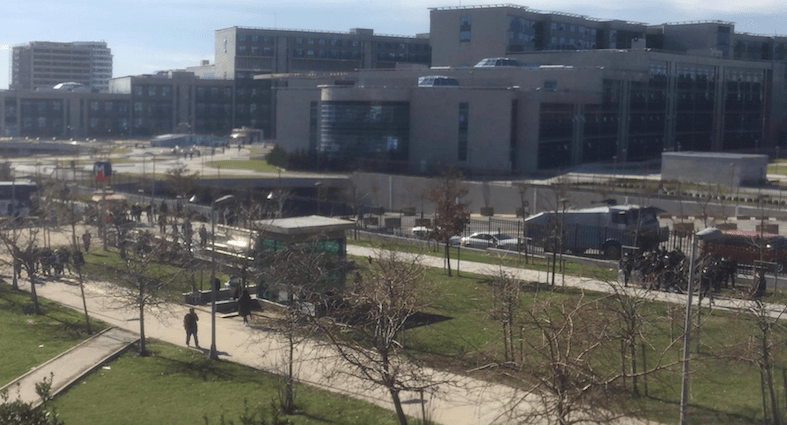 Kartal Adliyesi kuşatılmış durumda. Adliye’nin dışında polis kuş uçurmuyor. Tüm kapılar TOMA, akrep, çevik yığınağıyla tutulmuş. Arkadaşları, yoldaşlarıyla dayanışma amacıyla gelenleri polis kapılara yaklaştırmıyor. Gelen herkese GBT yaptılar. Görece sakin görünen aşağı kapıya gidildi, fakat orası da geniş bir noktadan çembere alınmış. Polis “salgın hastalık” gerekçesiyle sürekli dağılın anonsu yapıyor.