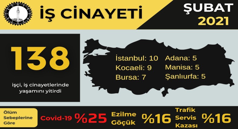 İşçi Sağlığı ve İş Güvenliği (İSİG) Meclisi Şubat ayı iş cinayetleri raporunu açıkladı. Ulusal-yerel basından, işçilerin iş arkadaşlarından, işyeri hekimleri ve iş güvenliği uzmanlarından, meslek örgütü ve sendikalardan edinilen bilgilerle hazırlanan rapora göre Şubat ayında en az 138 işçi iş cinayetlerinde hayatını kaybetti. Dört çocuğun, yedi kadının, 46 51 yaş üstü çalışanın hayatını kaybettiği Şubat ayında, ölüm nedenleri sıralamasında korona, düşme, ezilme, trafik kazası başı çekti.