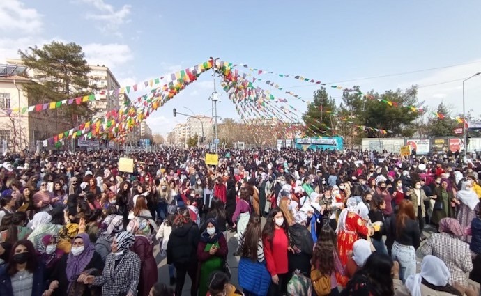 Dicle Amed Kadın Platformu (DAKP) öncülüğünde “Kadın kırımına karşı yaşamı, tecride karşı özgürlüğü savunuyoruz” şiarıyla Diyarbakır İstasyon Meydanı’nda düzenlenen 8 Mart Dünya Kadınlar Günü mitingi başladı. Mitinge Özgür Kadın Hareketi (TJA), Halkların Demokratik Partisi (HDP) Kadın Meclisi ve Genç Kadın Meclisi, İlerici Kadınlar Meclisi, Rosa Kadın Derneği, Kadın Akademisi ile çok sayıda kadın örgütü temsilcisi, HDP Diyarbakır milletvekilleri Remziye Tosun, Semra Güzel, Dersim Dağ, Devrimci İşçi Sendikaları Konfederasyonu (DİSK), Türk Mimar ve Mühendisler Odaları Birliği (TMMOB), Özgürlük İçin Hukukçular Derneği (ÖHD) ve Türkiye İşçi Partisi (TİP) üyesi yüzlerce kadın katıldı.