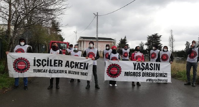 Depo, Liman, Tersane ve Deniz İşçileri Sendikası’nda (DGD-Sen) örgütlendikleri, tacizci amirlere ve mobbinge karşı direndikleri için Kod-29 denilen ahlaksızlıkla tazminat haklarına da çökülerek işten atılan Migros depo işçileri direnişlerinin 86. gününde bir kez daha Tuncay Özilhan’ın Beykoz’daki villası önündeydi.