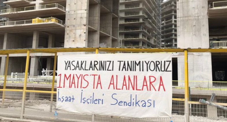 İnşaat-İş, devletin pandemi önlemleri adı altında getirdiği keyfi uygulamaların son noktada alenen 1 Mayıs çalışmalarının engellenmesi biçimini almasına karşı yasakları tanımayacağını astığı pankartla bir kez daha ilan etti.