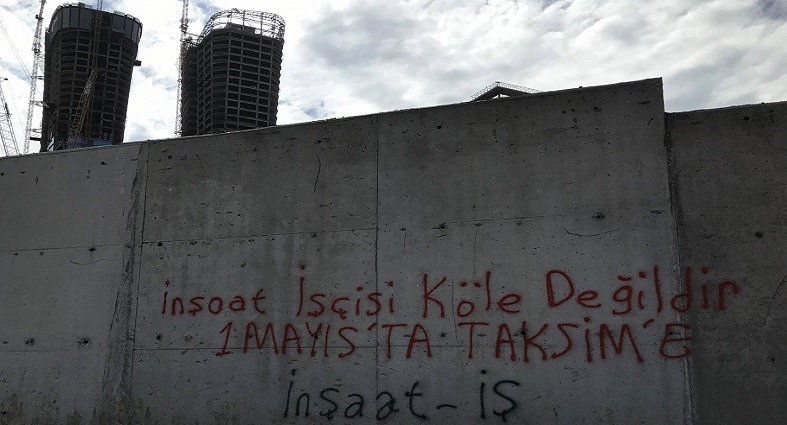 İnşaat-İş Finans Şehir şantiyesinin birçok noktasında yaptığı yazılamalarla işçileri 1 Mayıs’ta alanlara, Taksim’e davet etti