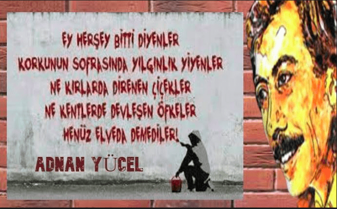 “Duvarlara yazılıyor şimdi dizelerin / Her dizene ayrı tınılar dökülüyor yüreklerden / Her dörtlüğün ayrı bir kızıllık katıyor kavgaya / Sen ki, / ‘Kavganın Şairi’ demişiz adına / Koca bir tarihi taşıyorsun günümümüze / Bu tarihten yürüyoruz / Çocuk gülüşleriyle betimlediğin ufuklara / Tıpkı dediğin gibi, ‘kapkara bir acıyı’ / Bembeyaz yüreğimizde duya duya…” [Bir yoldaşından Adnan’a]