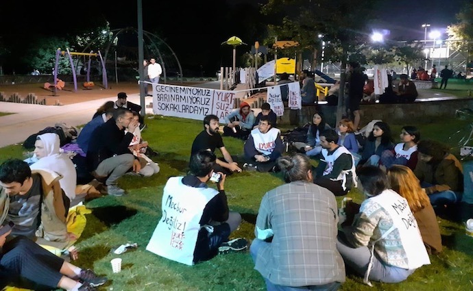 Barınamayanlar’ın nöbet eylemi İzmir’de 6., Türkiye genelinde 7. gününde. Öğrenciler nöbetlerinin 4. gecesini de İzmir Bornova Mehmet Suphi Kula Parkı’nda ve Hasanağa Bahçesi’nde halaylarla oyunlarla sürdürüyor.