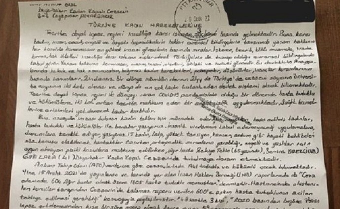 “Bu devletlerin Anayasalarında hukuk ve hak savunucuları, bağımsız kadın hareketleri, düşünürler, inançlar kuramlarının başında tanımlanır. Zindansız bir dünya mümkün denen 21’inci yüzyılda Türkiye’de cezaevi sayısının üniversite sayısının iki katı olması ve dünyada en çok kadın tutsak eden devlet sistemi olarak bilinmektedir. Tecride dayalı infaz rejimiyle dünyayı saran koronanın olduğu bir dönemde hasta tutuklu ve hükümlülere iki kat artan tecride mahkum eden bir adaletsizlik uygulanmaktadır. Sağlık hizmetlerine erişimleri yok denecek kadar kısıtlıdır. Bu aşağıda imzası bulunan kadın hakları için mücadele ederken hayatları hapsedilmiş kadınlar, hasta tutuklu ve hükümlüler ile beraber yaşıyoruz.