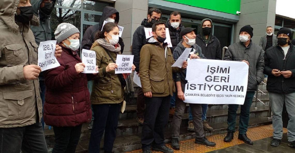6 yıldan fazla zaman Çankaya Belediyesi’ne bağlı ÇANPAŞ şirketinde güvenlik görevlisi olarak çalışan, 31 Ocak 2021’de Ankara Valiliği kararıyla güvenlik kartı iptal edilerek işten atılan, daha sonra sendikayla yapılan toplu sözleşmeden yararlanarak katı atık bölümünde işe yerleştirilen, kimlik kartının iptali davasının aleyhte sonuçlanmasıyla buradan da atılan ve sendikanın hukuki yollar dışında bir şey önermemesi nedeniyle filli meşru mücadeleye başlayacağını açıklayan Yasin Keskin, belediye önünde direniş başlattı.