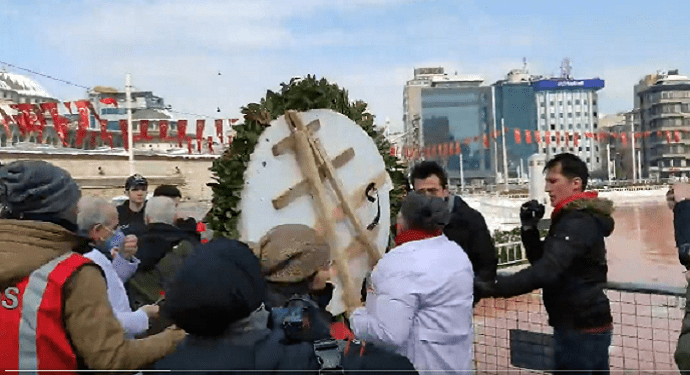 14 Mart Tıp Bayramı’nda geleneksel olarak Taksim Anıtı’na bırakılan çelenk, bu yıl polis tarafından engellendi. Beyoğlu Kaymakamlığı’nın yasak kararı gerekçe gösterilerek hekimlerin Anıt’a gidişi barikat ve polis zoruyla engellendi. 1919’daki işgal koşullarında bile bu Anıt’a çelenk bıraktıklarını, sözkonusu yasağın kabul edilemez olduğunu belirten hekimler, polis barikatının açılmasını istedi. Bu sırada yaşanan arbedede 80 yaşlarındaki bir hekim yere düşürüldü. Bu yasakçı tutumun AKP’li Cumhurbaşkanı Erdoğan’ın son olarak “giderlerse gitsinler” söyleminde dile gelen düşmanca tutumla doğrudan ilişkili olduğunu bilen hekimler “Utan, utan, utan Erdoğan!” diyerek durumu protesto ettiler.