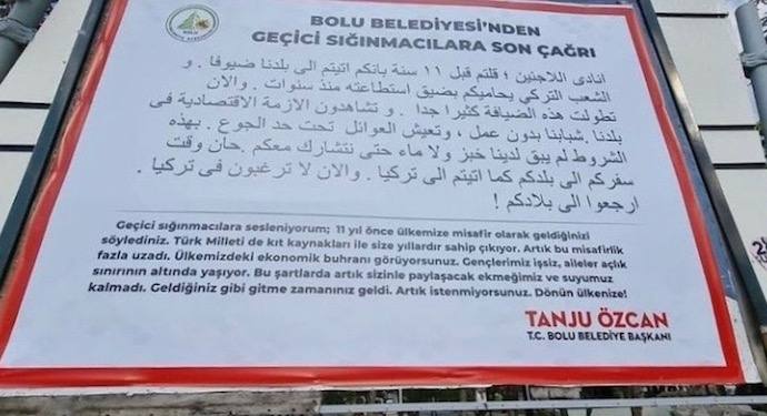 Ancak elbette kendi gibi olanlar dışındaki herkese, dolayısıyla da insanlığa korkunç bir nefret besleyenlerde olduğu gibi Özcan da durmuyor. Şimdi de bilboardlara dev ilanlar astırarak sığınmacıları ülkeyi terk etmeleri konusunda tehdit ediyor. Arapça ve Türkçe yazdırdığı ilanda “Gençlerimiz işsiz, aileler açlık sınırında yaşıyor” diyerek burjuvazinin ‘beyazlar’ının tüm kibriyle “sizinle paylaşacak ekmeğimiz ve suyumuz kalmadı, artık istenmiyorsunuz, ülkenize dönün” diyor.