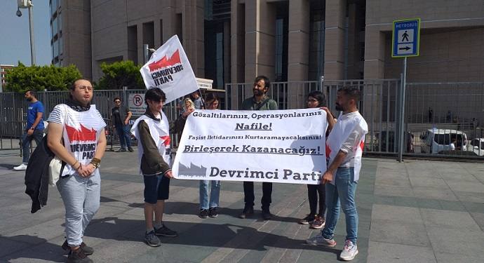 İstanbul’da Mahir Çayan posterinde parmak izleri olduğu gerekçesiyle gözaltına alınan Devrimci Parti üyesi Eser Tüz ve Dev İşçi-Sen Genel Başkanı Mazlum Oruç bugün İstanbul Adliyesine sevk edildi. Gözaltıları protesto etmek için Tüz ve Oruç’un getirileceği İstanbul Adliyesi önünde basın açıklaması yapıldı. Devrimci Parti’liler ve dayanışma amacıyla orada bulunan ESP Eş Genel Başkanı Şahin Tümüklü açıklama sonrasında polis saldırısıyla gözaltına alındı.