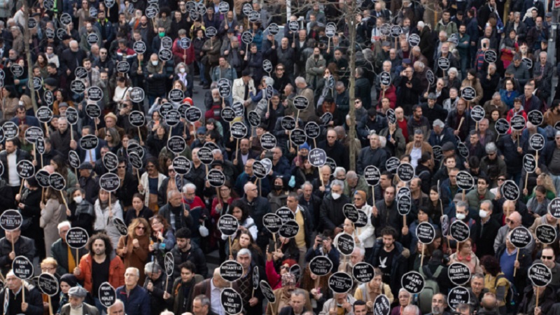 16 yıl önce bir kontrgerilla tetikçisi tarafından Genel Yayın Yönetmeni olduğu Agos Gazetesi’nin ofisinin bulunduğu Sebat Apartmanı önünde kalleşçe katledilen Hrant Dink, bugün yine halklar arasındaki düşmanlıkların ortadan kalktığı bir dünya özlemiyle hüznün iç içe geçtiği duygularla anıldı. Her yıl olduğu gibi Sebat Apartmanının önünde yüzlerce insan toplandı. Dillerden Hrant’ın bedenini siper ettiği düşmanlıklara karşı barışın, kardeşliğin, başka bir dünya özleminin ifadesi olan sloganlar vardı. “Yaşasın halkaların kardeşliği!”, “Biz bitti demeden bu dava bitmez!”, “Katil devlet hesap verecek!”, “Faşizme inat, kardeşimsin Hrant!”, “Hrant için adalet!” sloganlarına aynı içerikli dövizler eşlik etti. Agos’un o zamanki binası olup Hrant’ın önünde katledildiği Sebat Apartmanı’ndan dev bir Hrant posteri sallandırıldı. Ona dair konuşmalar o zamanki ofis şimdiki 23,5 Hafıza Mekanı olan dairenin penceresinden yapıldı.