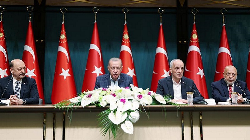 Saray’da yapılan açıklamaya Tayyip Erdoğan’ın yanı sıra Çalışma Bakanı Vedat Bilgin, Türk İş Başkanı Ergün Atalay ve Hak-İş Başkanı Mahmut Arslan yer aldı.