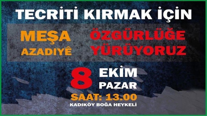 Halkların Demokratik Kongresi (HDK), Halkların Demokratik Partisi (HDP), Yeşiller ve Sol Gelecek Partisi (Yeşil Sol Parti), Demokratik Bölgeler Partisi (DBP), Tevgera Jinên Azad (TJA), Anadolu Yakınlarını Kaybedenlerle Yardımlaşma ve Dayanışma Derneği (ANYAKAYDER), Marmara Tutuklu ve Hükümlü Aileleri İle Dayanışma Derneği (MATUHAYDER), Demokratik Alevi Dernekleri (DAD), Özgürlük İçin Hukukçular Derneği (ÖHD), Mezopotamya Kültür Merkezi (MKM), Kürt Araştırmaları Derneği (Enstîtû ya Kurdî) ve Göç İzleme Derneği (GÖÇİZDER), PKK Lideri Abdullah Öcalan’a yönelik 9 Ekim 1998’de devreye konulan uluslararası komplonun 25’inci yılında, “Tecrit kırılıncaya dek özgürlük yürüyüşümüz devam edecek” şiarıyla eylem gerçekleştirecek. 8 Ekim Pazar günü, Kadıköy’de bulunan Boğa Heykeli önünde yapılacak olan protesto eylemine her kesimden büyük bir katılım sağlanması bekleniyor. 9 Ekim komplosunun protesto edileceği eylemde, Abdullah Öcalan üzerinde 31 aydır süren mutlak iletişimsizlik ile 24 yıldır uygulanan ağırlaştırılmış tecridin son bulması ve fiziki özgürlüğünün sağlanması temel gündemler olacak.