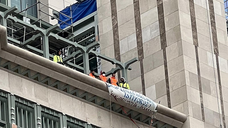 Finans Merkezi Merkez Bankası şantiyesinde bazıları 2, bazıları 3 yıl çalışan İnşaat-İş ve Dev Yapı-İş üyesi işçiler, yüklenici firma Limak Holding ve işin asıl sorumlusu Emlak Konut’un ödemeye yanaşmadığı yasal hakları için 8 gündür direnişte. Direnişin 7. günü olan dün, hakları gasbedilen işçiler, Merkez Bankası şantiyesinin 5. katını işgal etti, sendika temsilcileri de tüm engelleri aşarak Limak’ın şantiye içindeki merkez ofisi önüne giderek tepkilerini bir kez daha ifade etti, işbaşı yapan işçilere direnişin nedenini, patronların tutumunu anlattı.