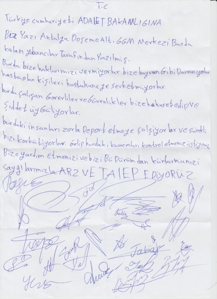 İranlı Eshaghi’nin el yazısı ve 52 mültecinin imzasıyla Türkiye Cumhuriyeti Adalet Bakanlığı’na hitaben yazılan ve avukat Ferhat Doruk aracılığıyla Antalya Cumhuriyet Savcılığı’na iletilen dilekçede, şu ifadeler yer aldı: “Bu yazı, Antalya Döşemealtı GGM Merkezi’nde kalan yabancılar tarafından yazılıyor. Burada bize haklarımızı vermiyorlar. Bize hayvan gibi davranıyorlar. Hasta olan kişileri hastaneye sevk etmiyorlar. Burada çalışan görevliler ve güvenlikler bize hakaret edip, şiddet uyguluyorlar. Buradaki insanları deport etmeye çalışıyorlar ve sürekli bizi korkutuyorlar. Gelip buradaki kameraları kontrol etmenizi istiyoruz. Bize yardım etmenizi ve bu durumdan kurtarmanızı saygılarımızla talep ediyoruz.”