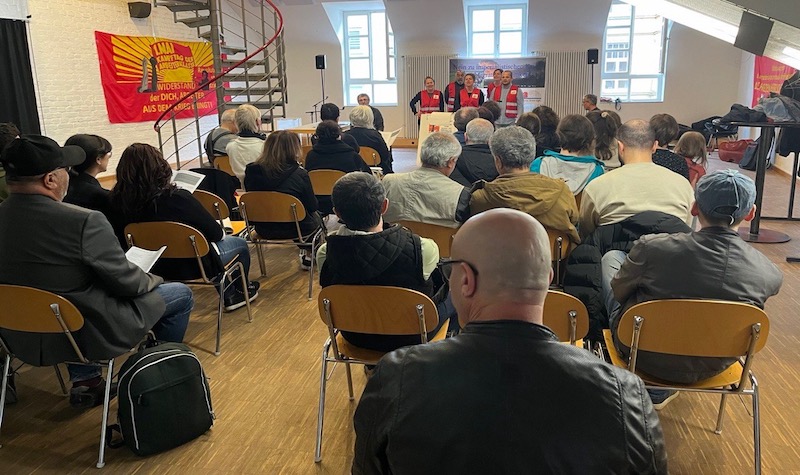 “Burada savaş ve onun insanlığı yok eden yıkıcı sonuçlarına, emperyalist kapitalistlerin kendi aralarındaki rekabete değinmeyeceğiz. Zira salonda bulunan herkes bunun bilincinde ve buna karşı mücadele ediyor. Silah tekellerinin, sadece Almanya’daki Rheinmetall’in 2026 yılına kadar 13 ila 14 milyar euroluk satış elde etmeyi beklemesi dahi savaşların amacını özetliyor.