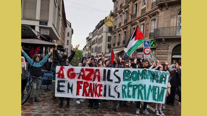 Strasbourg Üniversitesi öğrencileri Filistin’de derhal ateşkes çağrısıyla 21 Mayıs 2024 tarihinde eylem yaptı.