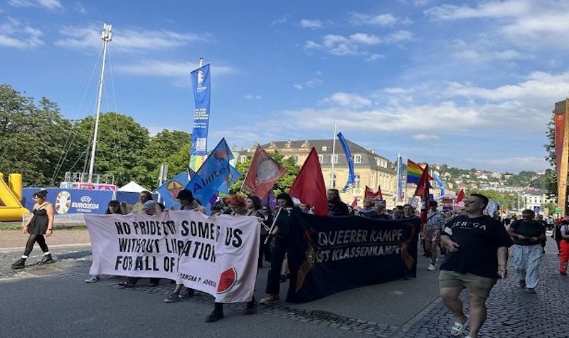 Queer Revolutionaer, SDS Stuttgart, Sozial Radikal Gegens Kapital, Revolution Germany, Young Struggle’ın içinde bulunduğu Antifaschistische Queere Aktion Stuttgart, tarafından yapılan konuşmalarda, “Gökkuşağı kapitalizmi ve pinkwashing’a yer yok” (pembeye boyama-badanalama-kendini “eşcinsel dostu” olarak pazarlama) denildi. Onur Yürüyüşü’nün çıkış noktası olan Stonewall tarihi anlatıldı.