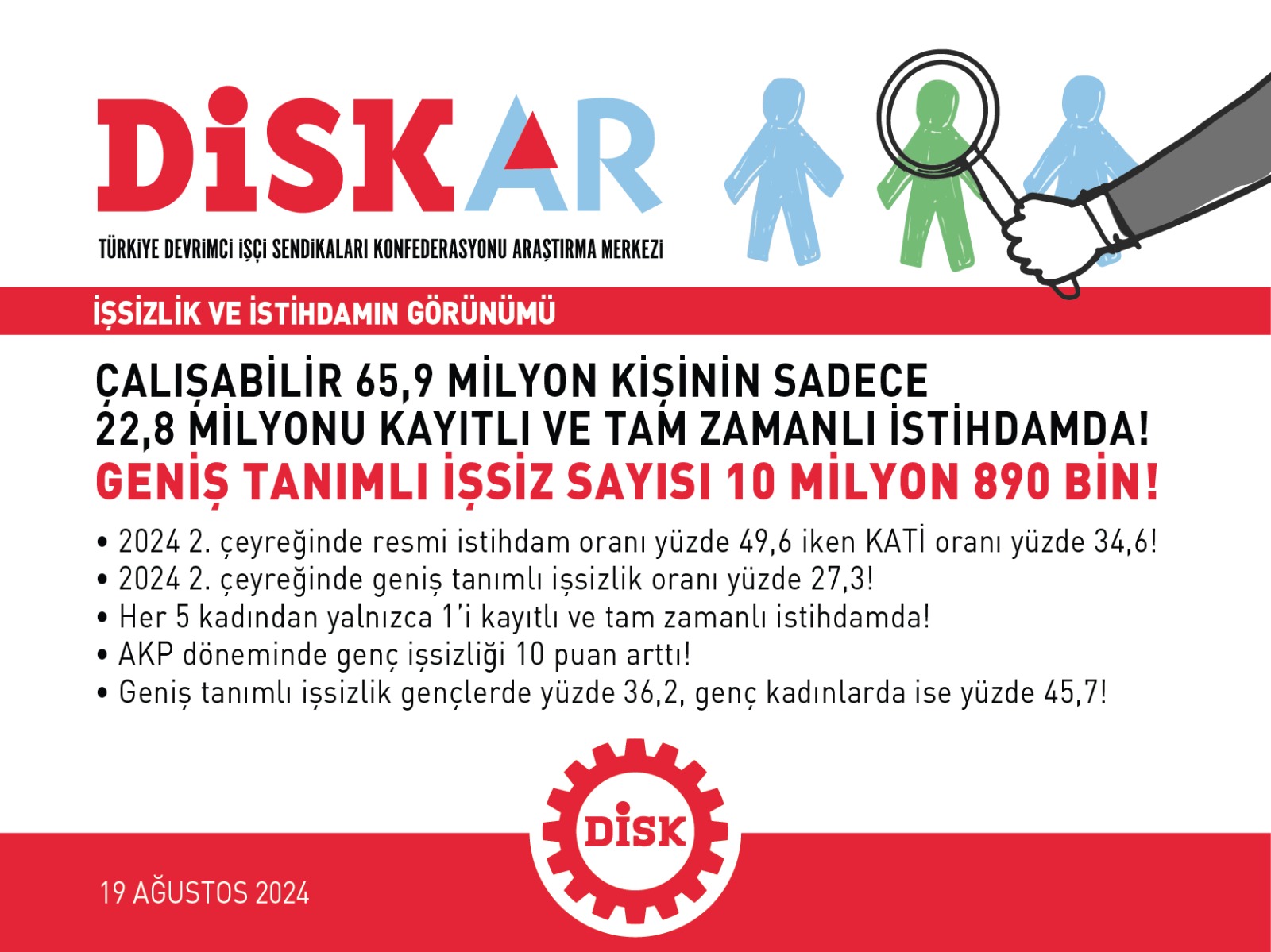 DİSK-AR, Türkiye İstatistik Kurumu’nun (TÜİK) bugün yayınlanan 2024 2’inci çeyrek dönemine ait Hanehalkı İşgücü Araştırması (HİA) raporunu değerlendirdi. TÜİK verilerinden yola çıkılarak hazırlanan raporda, çalışabilir 65,9 milyon kişinin sadece 22,8 milyonunun kayıtlı ve tam zamanlı istihdamda olduğu, 2024’ün 2’inci çeyreğinde geniş tanımlı işsiz sayısının 10 milyon 890 bine yükseldiği tespit edildi.