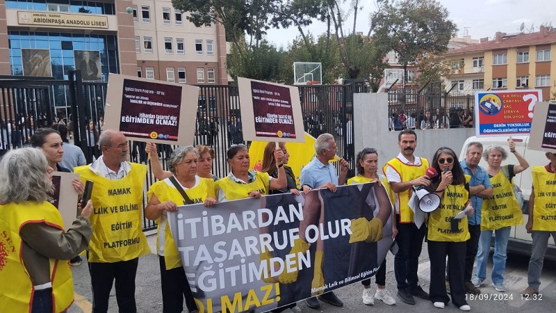 İlmek Kadın Dayanışması’nın da bileşeni olduğu Mamak Laiklik ve Bilimsel Eğitim Platformu, Abidinpaşa Anadolu Lisesi önünde yaptığı basın açıklamasıyla eğitim politikalarını protesto etti.