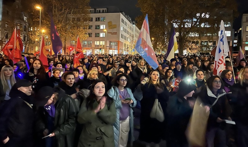 Die Linke temsilcisi konuşmasında, Türkiye’deki faşist rejimi kınadı ve “Türkiye’de her gün 3 ile 10 arası kadın cinayeti yaşanıyor. Yine siyasal nedenlere dayalı, kadına yönelik işlenen suçlar iki katına çıktı. Devlet, mahkemeler ve polis, suçu hafifleterek ve göz yumarak bu kadın cinayetlerinin önünü açıyorlar. Kadına yönelik şiddet tekil bir olay değil sistematik ve siyasi bir sorun. Kadınlar yeterince korunamıyor, çünkü devletin üzerine kurulduğu ataerkil sistem bunu engelliyor. Türkiye’nin tekrar Istanbul Sözlesmesi’ne geri dönmesini istiyoruz“ dedi.