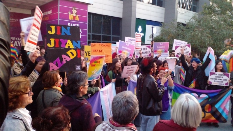 Kolej Metro çevresini yoğun abluka altına alan ve Kolej Metro’ya yığınak yapan Ankara Emniyeti, eyleme katılmaya gelenlerin toplanmasına, engel olmak istedi. Fakat kadınlar ve LGBT+IQ’lar bütün bu engelleme ve provokatif girişimlere rağmen Ziya Gökalp Caddesi üzerinde sloganlar, alkışlar ve zılgıtlarla bir araya gelerek yürüyüşe geçtiler. Bu sırada LGBT flaması olan arkadaşa saldırarak LGBT flamasını kin ve nefretle koparıp aldılar. Flamayı taşıyan arkadaşı gözaltına almaya çalıştılarsa da kadınlar buna engel oldu.