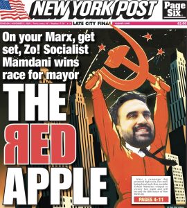 Mamdani’nin sosyalizmi, kendi tanımlamasıyla, “Herkes için daha iyi bir gelir dağılımı” söylemine dayalı ve otobüslerin ücretsiz olması, bazı kriterlere uyan kiraların dondurulması, belediyeye ait, dolayısıyla fiyatların daha ucuz olacağı marketlerin açılması ve ailelere çocuk bakım desteği gibi sosyalizm kırıntısı vaatlerden oluşuyor. Yani sosyal harcamaların olduğu bir kapitalizm. Bu bile New York Post’un manşetine Mamdani’yi elinde orak-çekiçle çizmesine ve Cumhuriyetçilerin, bazı Demokratların ve Elon Musk gibilerinin Mamdani’den komünist olarak bahsetmesine yetti. Müslüman olduğu için New Yorklulara 11 Eylül’ü hatırlatan ırkçı paylaşımlar da gırlaydı.