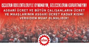 DİSK Genel Başkanı Arzu Çerkezoğlu, Yönetim Kurulu adına yaptığı açıklamada bir grup AKP milletvekilinin 17 Aralık'ta Meclis Başkanlığı'na sunduğu “Gelir Vergisi Kanunu ve Bazı Kanunlarda Değişiklik Yapılmasına Dair Kanun Teklifi”nin Çalışma Bakanı Vedat Bilgin'in açıklamalarıyla çeliştiğini, Bilgin tüm ücretlerin asgari ücret tutarı kadarından gelir vergisi alınmayacağını açıkladığı halde, teklifin sadece asgari ücreti vergi dışında bıraktığını belirtti. Yasalaşması durumunda tüm çalışanların asgari ücretli hale gelmesine neden olacağına dikkat çekerek geri çekilmesini istedi