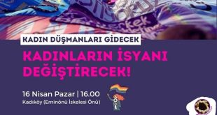Devamını Oku »Bir mektupla kadınlara seslenen Kadınlar Birlikte Güçlü, "Kadın düşmanları gidecek; kadınların isyanı değiştirecek!" diyerek 16 Nisan Pazar günü saat 16:00'da Kadıköy İskele’de yapılacak buluşmaya çağırıyor