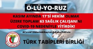 Türk Tabipleri Birliği, kasım ayında 17’si hekim olmak üzere toplam 63 sağlık emekçisinin koronavirüs nedeniyle hayatını kaybettiğini duyurdu