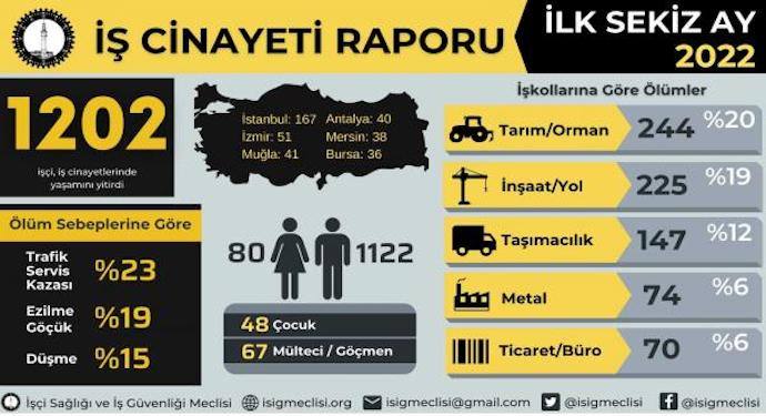 İşçi Sağlığı ve İş Güvenliği (İSİG) Meclisi, 2022’nin ilk 8 ayında alınmayan önlemler nedeniyle meydana gelen iş cinayetlerine ilişkin raporunu açıkladı. Buna göre, ağustos ayında 186, ilk 8 ayda 1202 işçi iş cinayetlerinde yaşamını yitirdi. Rapora göre ilk sekiz ayda meydana gelen iş cinayetlerinin aylara göre dağılımı şöyle: Ocak ayında …