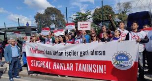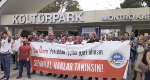 DİSK’e bağlı Gıda-İş Sendikası üyesi işçiler, Kültürpark Montrö Kapısı önünde toplanıp, “Sendika haktır engellenemez”, “Atılan işçiler geri alınsın”, “Birleşe birleşe kazanacağız” sloganları attı. Philip Morris grubu sigara fabrikasının taşeron firması Euroserve’nin Çankaya’daki ofisi önüne kadar yürüyen işçiler burada basın açıklaması yaptı. İşten atılan 103 kişinin geri alınmasını isteyen işçiler, ücretlerinin …